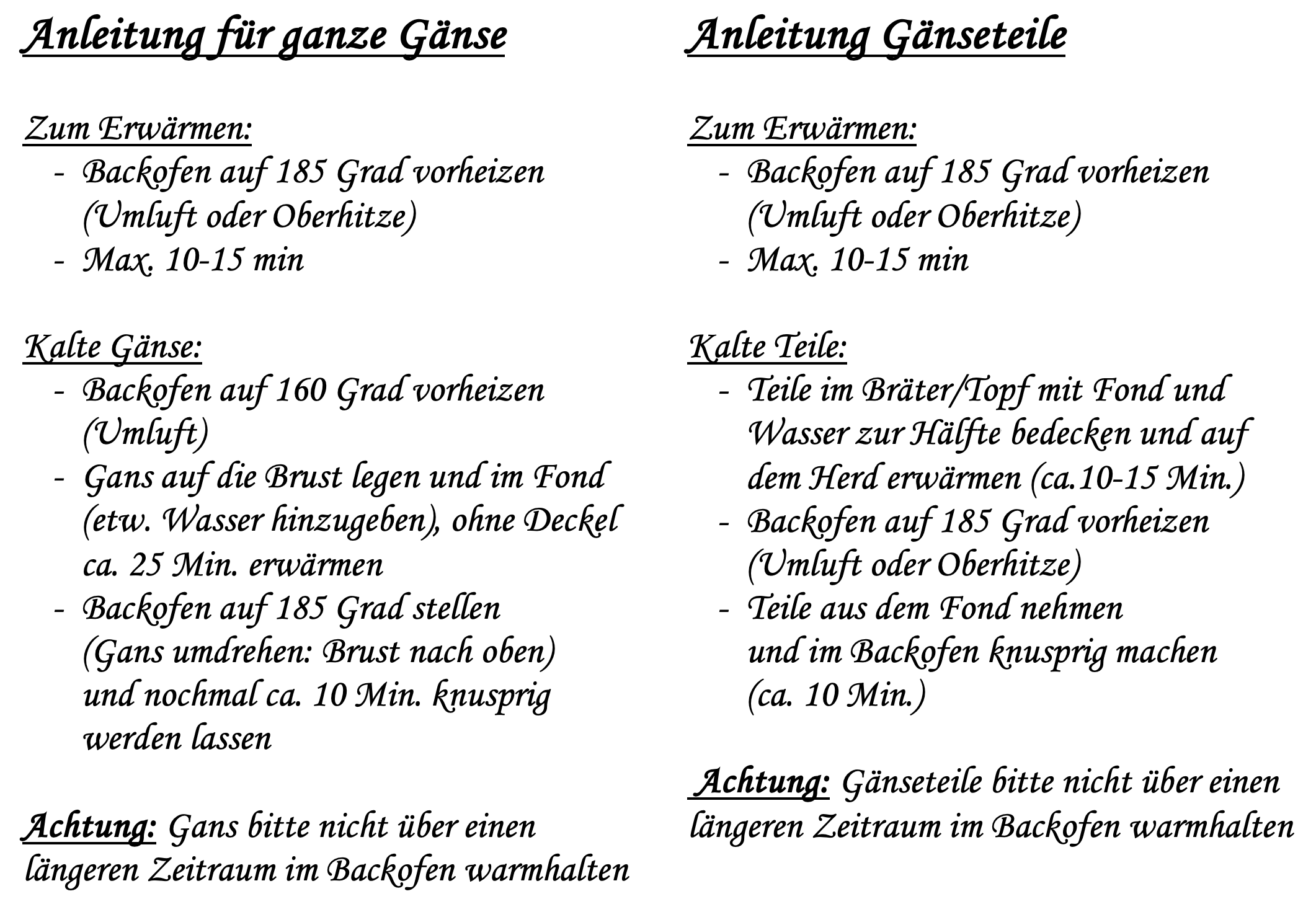 Sie können bei uns auch eine frische/rohe Gans oder Ente (inkl. Innereien) zum selber zubereiten bei uns bestellen. Diese muss am 23.12. zwischen 11 Uhr und 19 Uhr abgeholt werden