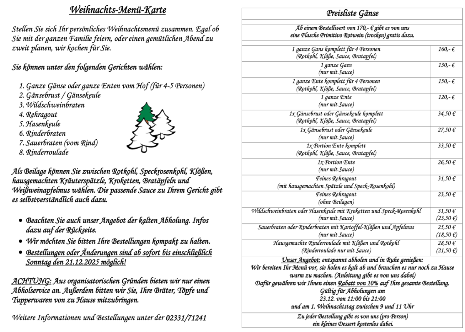 An Heiligabend und den Weihnachtsfeiertagen (24./25. und 26.12.) haben Sie die Möglichkeit sich von uns Ihre köstliche Weihnachtsgans (oder Ihr spezielles Weihnachtsmenü) für zu Hause braten zu lassen.